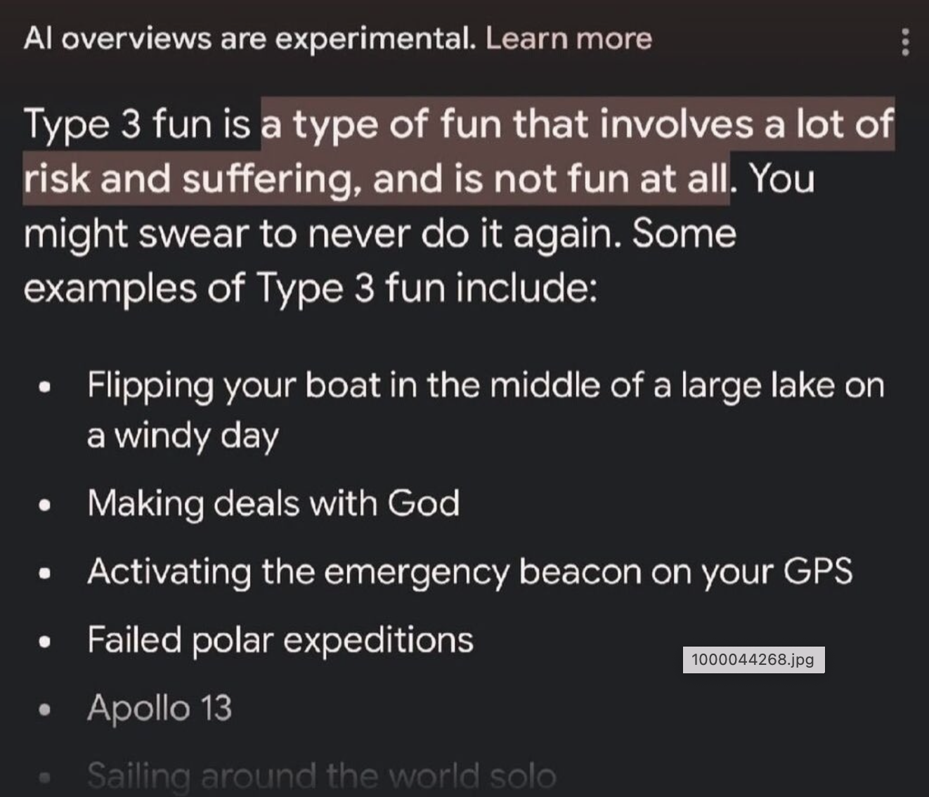 Mostly in outdoor adventure contexts, there’s this idea of three types of fun. Type 1 fun is fun while it’s happening, and also afterwards. Type 2 is not fun while it’s happening, but makes a good story. Type 3 is not fun while it is happening and also doesn’t make a good story after. I first heard about this concept from this screenshot of an Google AI overview: